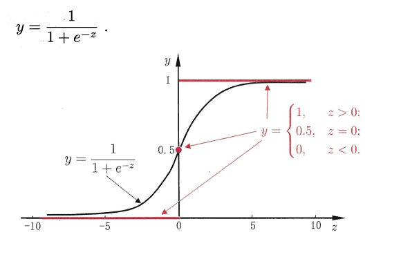 理想的函数是单位越阶函数,输出大于0判正,小于0判负。然而它是不连续的,需要一个连续的函数来替代。对数几率函数(logistic fucntion)