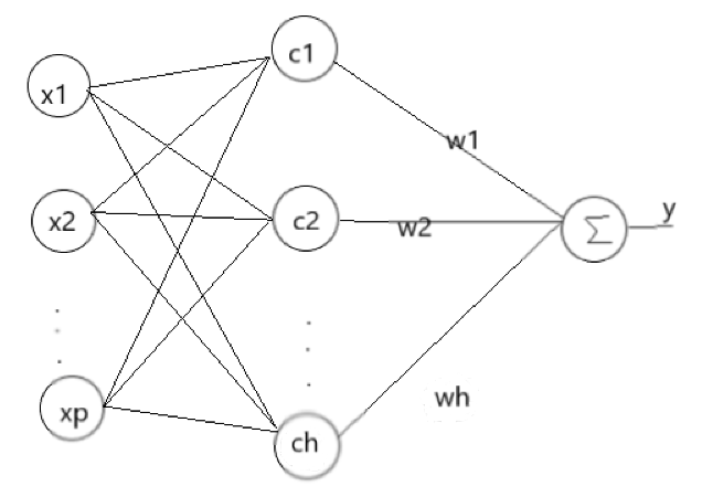 RBF神将网络是一种三层神经网络,其包括输入层、隐层、输出层。从输入空间到隐层空间的变换是非线性的,而从隐层空间到输出层空间变换是线性的。如下图所示。