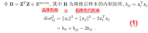 假定m个样本在原始空间中任意两两样本之间的距离矩阵为D∈R(mm),我们的目标便是获得样本在低维空间中的表示Z∈R(d’m , d’< d),且任意两个样本在低维空间中的欧式距离等于原始空间中的距离,即||zi-zj||=Dist(ij)。因此接下来我们要做的就是根据已有的距离矩阵D来求解出降维后的坐标矩阵Z。