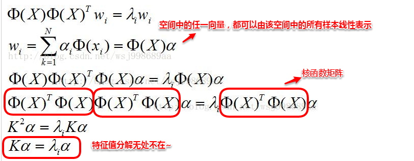 若核函数的形式已知,即我们知道如何将低维的坐标变换为高维坐标,这时我们只需先将数据映射到高维特征空间,再在高维空间中运用PCA即可。但是一般情况下,我们并不知道核函数具体的映射规则,例如:Sigmoid、高斯核等,我们只知道如何计算高维空间中的样本内积,这时就引出了KPCA的一个重要创新之处:即空间中的任一向量,都可以由该空间中的所有样本线性表示。证明过程也十分简单: