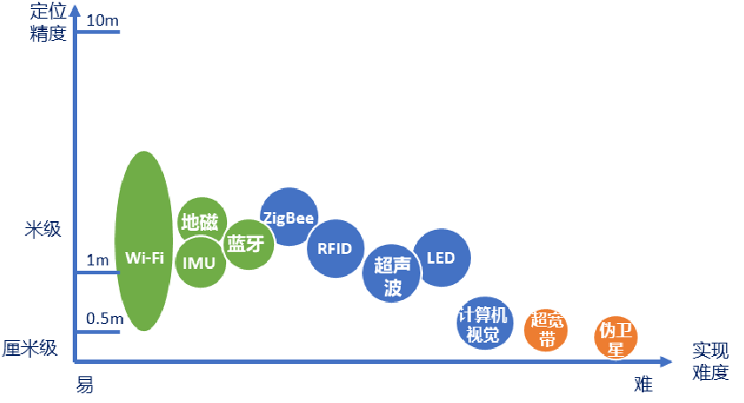 如图所示,不同的定位技术定位精度和难易程度都不同,目前的室内定位还没有一个统一普适的标准。因为业务场景复杂,精度需求不同,所以需要的解决方案也不一样。